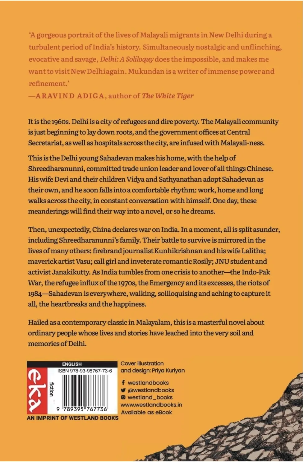 ‘A gorgeous portrait of the lives of Malayali migrants in New Delhi during a turbulent period of India’s history. Simultaneously nostalgic and unflinching, evocative and savage, Delhi: A Soliloquy does the impossible, and makes me want to visit New Delhi again. Mukundan is a writer of immense power and refinement.’ —Aravind Adiga, author of The White Tiger