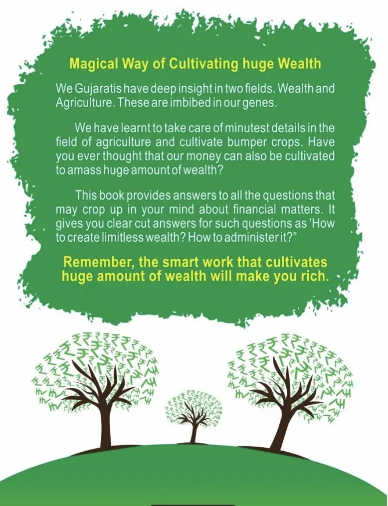 Magical Way of Cultivating huge Wealth We Gujaratis have deep insight in two fields. Wealth and Agriculture. These are imbibed in our genes. We have learnt to take care of minutest details in the field of agriculture and cultivate bumper crops. Have you ever thought that our money can also be cultivated to amass huge amount of wealth? This book provides answers to all the questions that may crop up in your mind about financial matters. It gives you clear cut answers for such questions as ‘How to create limitless wealth? How to administer it?” Remember, the smart work that cultivates huge amount of wealth will make you rich.
