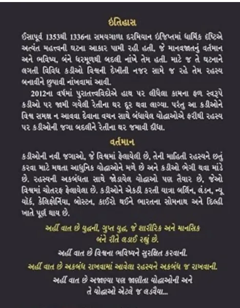 ઇતિહાસ ઈસાપૂર્વ 1353થી 1336ના સમયગાળા દરમિયાન ઇજિપ્તમાં ધાર્મિક દૃષ્ટિએ અત્યંત મહત્ત્વની ઘટના આકાર પામી રહી હતી, જે માનવજાતનું વર્તમાન અનેભવિષ્ય, બંને ધરમૂળથી બદલી નાંખે તેમ હતી. માટે જ તે ઘટનાને લગતી વિવિધ કડીઓ વિશ્વની દેખીતી નજર સામે જ રહે તેમ રહસ્ય બનાવીને છુપાવી નાંખવામાં આવી. 2012ના વર્ષમાં પુરાતત્ત્વવિદોએ હાથ પર લીધેલા કામના ફળ સ્વરૂપે કડીઓ પર જામી ગયેલી રેતીના થર દૂર થવા લાગ્યા. પરંતુ આ કડીઓને વિશ્વ સમક્ષ ન આવવાદેવાના વચન સાથે બંધાયેલ યોદ્ધાઓએ ફરીથી રહસ્ય પર કડીઓની જગા બદલીને રેતીના થર જમાવી દીધા. વર્તમાન કડીઓની નવી જગાઓ, જે વિશ્વમાં ફેલાયેલી છે, તેનીમાહિતી રહસ્યને છતું કરવા માટે મથતા આધુનિક યોદ્ધાઓને મળે છે અને કડીઓ ભેગી થવા માંડે છે. રહસ્યની અકબંધતા સાથે જોડાયેલ યોદ્ધાઓ પણ તૈયાર છે, જેઓવિશ્વમાં ચોતરફ ફેલાયેલા છે. કડીઓને એકઠી કરતી યાત્રા બર્લિન, લંડન, ન્યૂ યૉર્ક, કેલિફોર્નિયા, બોસ્ટન, કાઈરો થઈને ભારતના સોમનાથ અને દિલ્હી ખાતે પૂર્ણ થાય છે. અહીં વાત છે યુદ્ધની, ગુપ્ત યુદ્ધ, જે શારીરિક અને માનસિક બંને રીતે લડાઈ રહ્યું છે. અહીં વાત છે વિશ્વના ભવિષ્યને સુરક્ષિત કરવાની. અહીં વાત છે અકબંધ રાખવામાંઆવેલા રહસ્યને અકબંધ જ રાખવાની. અહીં વાત છે અજાણ્યા પણ જાણીતા યોદ્ધાઓની અને તે યોદ્ધાઓ એટલે જ લડવૈયા…
